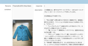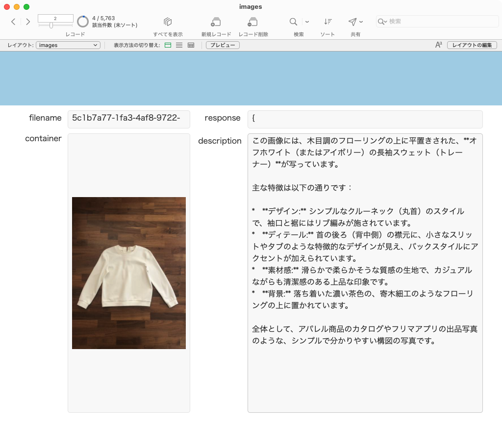 フィールド設定 [ images::description ; JSONGetElement ( images::response; "candidates[]content.parts[]text" ) ]